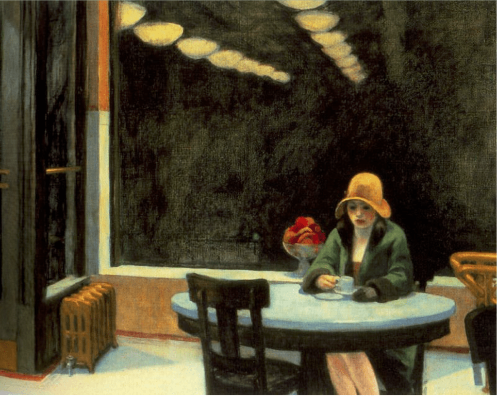 En este artículo hemos elegido la obra de Hopper denominada Automat, 1927 puesto que nos parece que muestra algo del caos melancólico bajo una distancia que nos conmueve y, que oscila entre, el placer que encontramos en la tristeza y el horror del vacío melancólico. La obra de Hopper se caracteriza por ser un arte figurativo en el que se muestra la representación de paisajes y de personas, en su mayoría mujeres, en grandes ciudades. Se trata de escenarios harto verosímiles que chocan con un halo enigmático que produce un efecto contrario, un efecto de irrealidad, de extrañamiento.