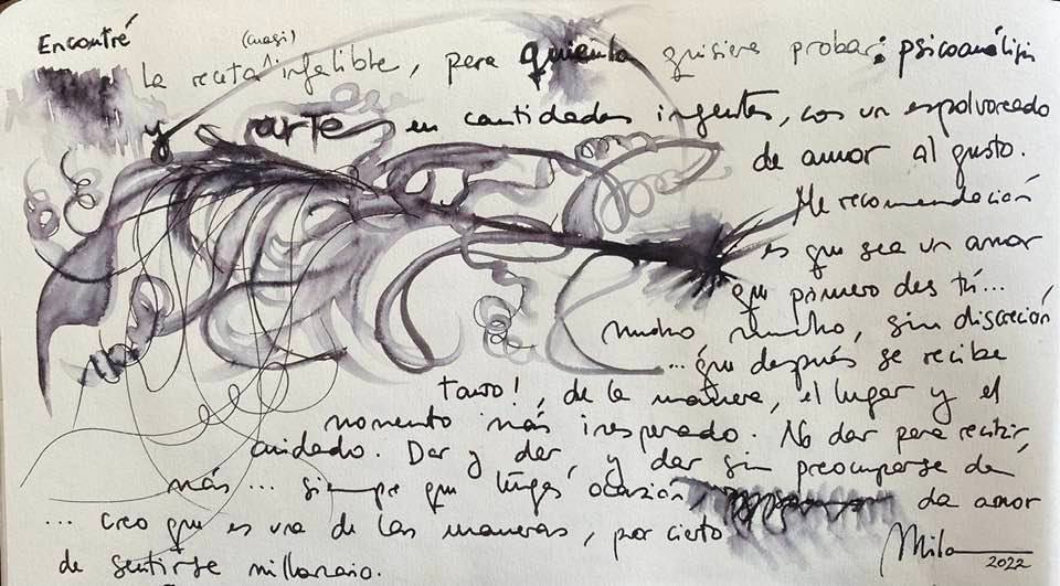 Mila Ruiz. Creo que efectivamente siempre ha estado conectado el psicoanálisis sin que yo lo supiera. Y el arte porque ha sido mi mejor manera de… ¿Cómo lo diría yo? es en términos del orden del encuentro, porque es en un encuentro conmigo misma. El arte siempre ha estado ahí, en mis momentos peores. Siempre ha parecido la posibilidad de hacer algún dibujo, unas rayas, una escritura… Una escritura siempre muy dibujada. Desde muy pequeña escribía poesías a mano y las ilustraba, con pluma por cierto. Y luego dibujaba cosas. Me hice mis cuadernos, me hacía mis propias publicaciones de poesías. Eso siempre ha estado ahí. Y momentos de estos de estar hasta las narices de todo. Recuerdo uno de mis mejores dibujos, era estando muy harta y muy aburrida en mi habitación, en verano que nunca, por distintas razones, me dejaban salir, tendría unos 12 años, me iba y ponía cosas de comer que me llevaba al cuarto, pero no tenía hambre, era un bocadillo de esos de pan de rosca con mucho volumen y corteza con salchicha… no me lo comía pero me puse a dibujarlo y me salió una cosa muy simpática. O sea que eso siempre ha estado ahí. Y yo creo que la relación con el psicoanálisis siempre ha estado ahí también, sin que yo me diera cuenta, que es mi propia locura. Mi locura me ha llevado de cabeza al psicoanálisis. Momentos muy amargos, momentos muy chungos, momentos muy difíciles, porque yo ahora estoy muy recompuesta, aquí donde me veis, son muchos años de análisis para estar hoy aquí llegando incluso a decir que amo la vida, mi vida y estar viva.