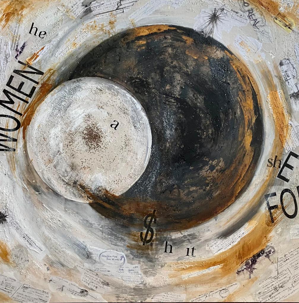 Mix media (flores secas, tallos de paja, media de mujer, cera, tinta china, papel de seda…)